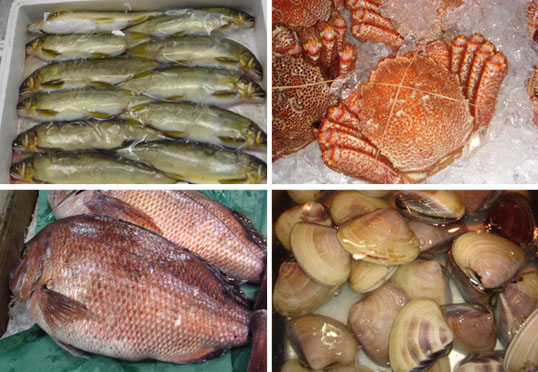 カニ類(タラバ、ズワイ 等) 貝類(ホタテ、アワビ 等) イカ類(モンゴイカ、アオリイカ、ヤリイカ 等) |